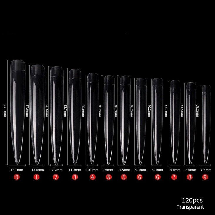• Set of 120 clear tips, 10 sizes (0–9)( double sizes 5,6)