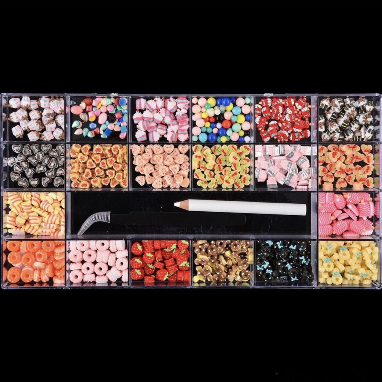 It comes with 20 different styles of 3D Donut and Candy Kawaii . Wax picker and twister come with a box as well.